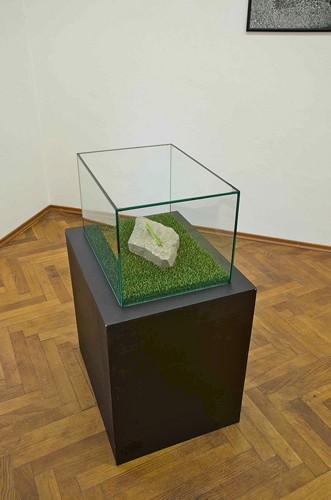El autor se ha inspirado en un muestrario de piedras de río que encontró en un depósito de materiales de construcción. Estos muestrarios le hicieron pensar en la comunicación, el intercambio, el despliegue, el orden, el accidente que confirma lo esperado y lo inesperado, los espacios o unidades en positivo y sus contrapartes en negativo. Disponer las piedras en estantes transmite la idea de “aquí estoy, esto soy, mírame, cómprame”, desplegados en una especie de retícula que se convierte en un sistema cartesiano de coordenadas.