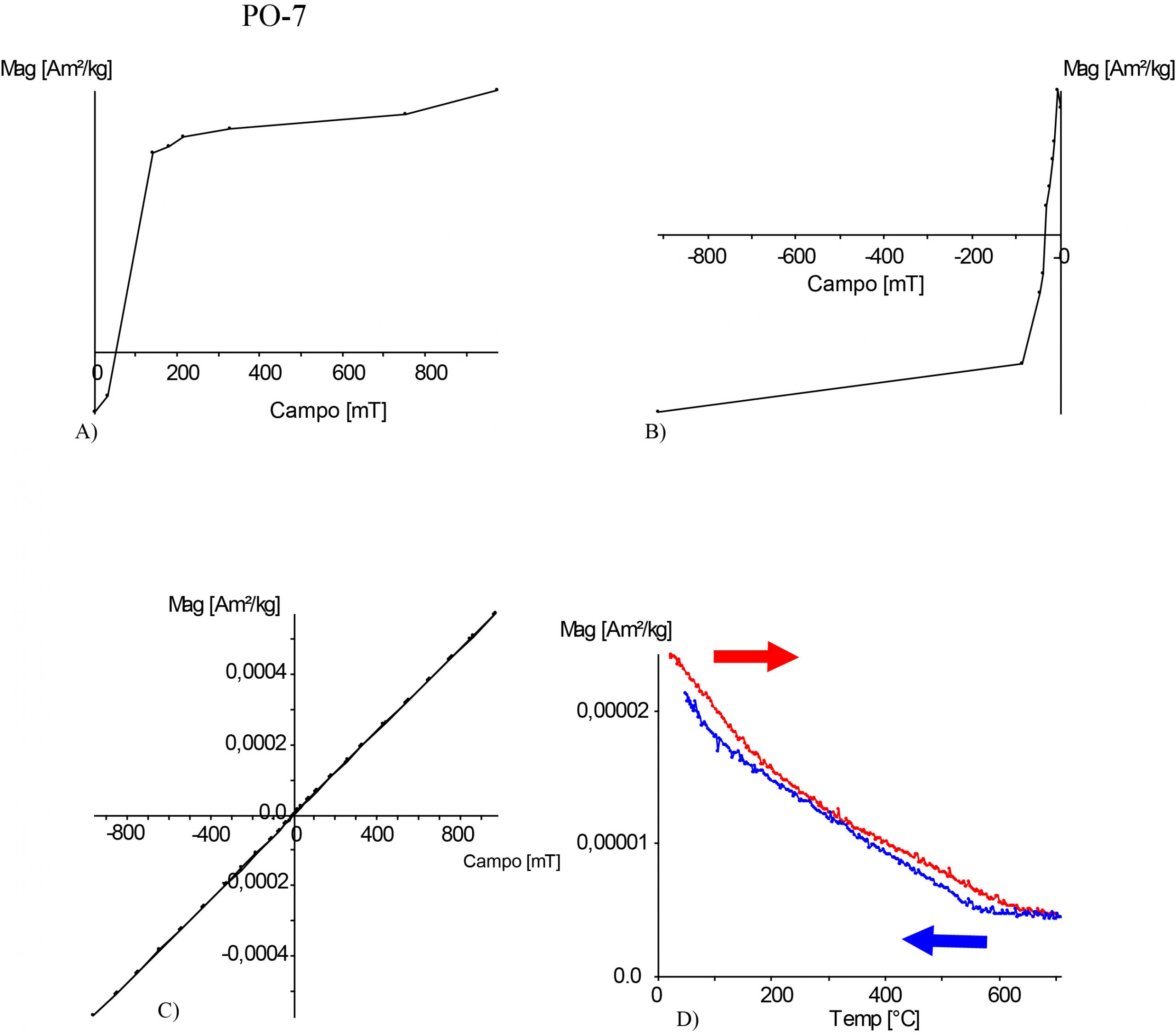 Gran parte de la magnetización en la muestra PO-2 (Fig. 10A), la cual es portada por el eje de alta coercitividad (eje Z), se pierde a 100 ºC, indicando la presencia de goethita. La magnetización restante se reparte de manera similar entre los tres ejes. Los ejes de baja e intermedia coercitividad (ejes X e Y respectivamente) muestran una caída de la magnetización en ~330 ºC, indicando la presencia de sulfuros de hierro (posiblemente pirrotina). Además, el eje X muestra una segunda caída en 580 ºC, indicando la presencia de magnetita. Finalmente, la magnetización del eje Z muestra temperaturas de desbloqueo en torno a 670 ºC, indicando la presencia de hematites. Por tanto, en esta muestra domina la pirrotina, conteniendo a su vez proporciones menores de magnetita y hematites.