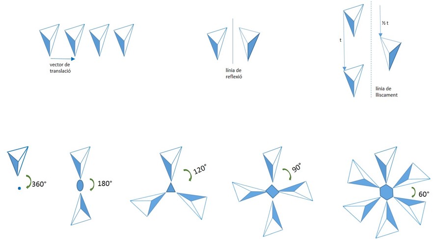 Traslación: Repetición periódica de un objeto en una determinada dirección. Los objetos están separados un cierto vector de traslación con un cierto módulo. Esta operación existe en todas las ornamentaciones infinitas, papeles pintados, mosaicos, interior de un cristal, etc. No está presente cuando se trata de un objeto finito, como un polígono o un poliedro.