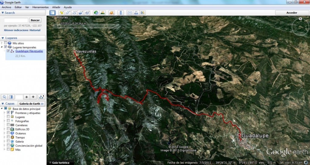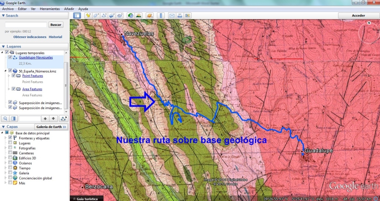 Una de las opciones más interesantes que ofrece GE es la posibilidad de cargar imágenes georreferenciadas, como por ejemplo la base geológica de España, permitiendo una vez creada la ruta superponer su base geológica.